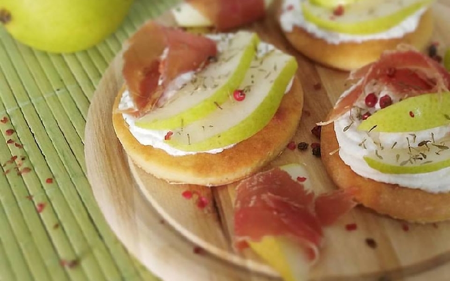 Spalmiamo su ciascuna pizzetta della ricotta e terminiamo con uno spicchio di pera e del prosciutto q.b Aggiungiamo altro timo..fresco sarebbe meglio e se volete del pepe rosso. Le nostre Pizzette rustiche allo yogurt con ricotta e pere sono pronte per essere servite e gustate.