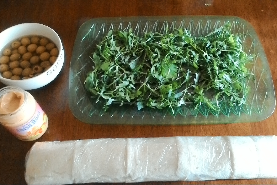 Lavare un po di rucola e metterla su un vassoio. Tagliare un pezzo del tronchetto e posizionarlo da lato, in modo de creare un ramo. Spalmare con della salsa cocktail e decorare usando una forchetta per fare delle righe. Mettere qualche oliva sopra.
