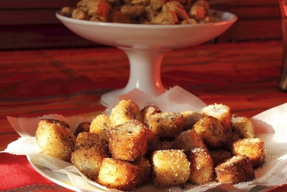 Laviamo la melanzana, tagliamola a fettine non troppo sottili, di medio spessore e grigliamo le stesse su una piastra antiaderente. Sulla stessa piastra andiamo ad abbrustolire la fettina di pane, dopodiché tagliamolo a cubetti piccoli