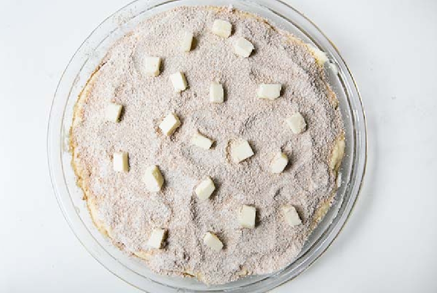 In una ciotolina mescolate lo zucchero di canna, la farina e la cannella per la guarnizione dello streusel. Spolveratelo sulla torta e cospargete con il burro.